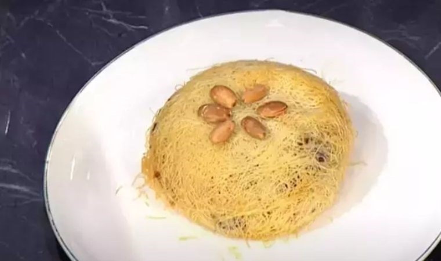 - Kadayıfı derin bir kaseye alıp üzerini ince bir şekilde kapatıp elinizle hafifçe düzleştirin ve ortasına pirinci ekleyin.