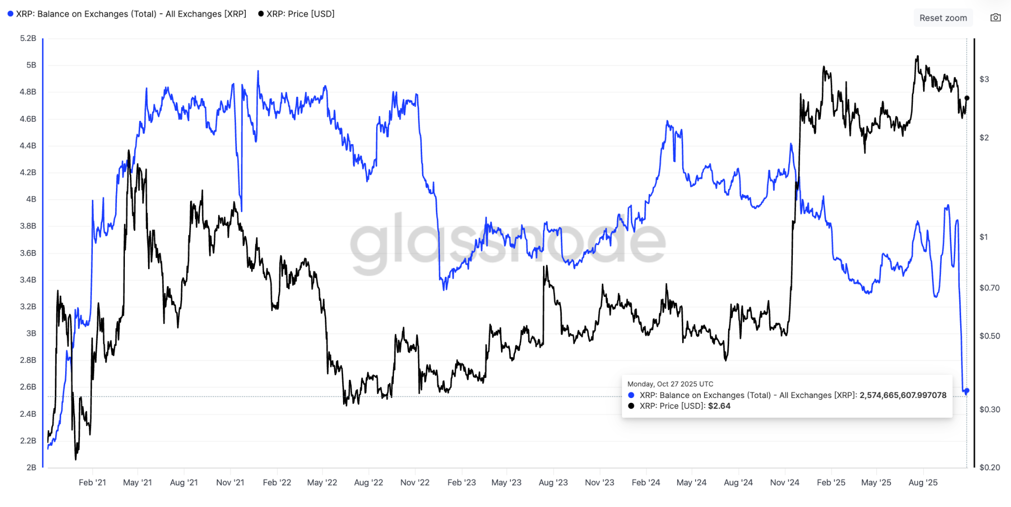 Aşağıdaki grafik, XRP bakiyesinin 20 Eylül’deki 3,9 milyardan Çarşamba günü 1,4 milyar tokenlik düşüşle 2,57 milyara düştüğünü gösteriyor.