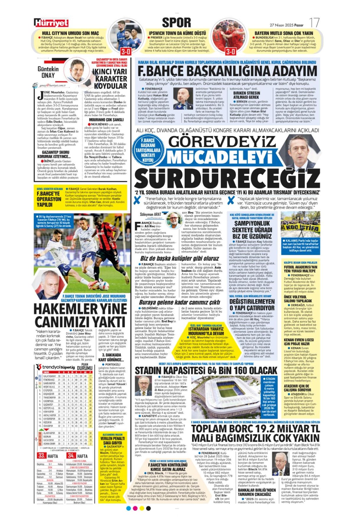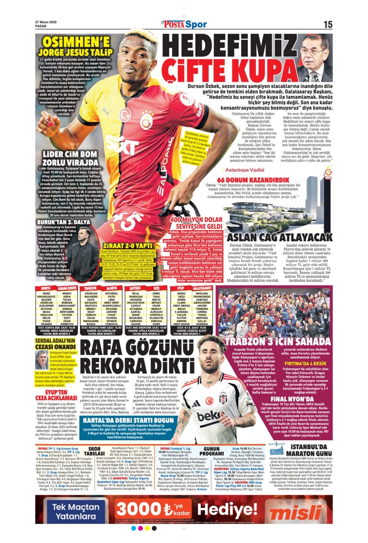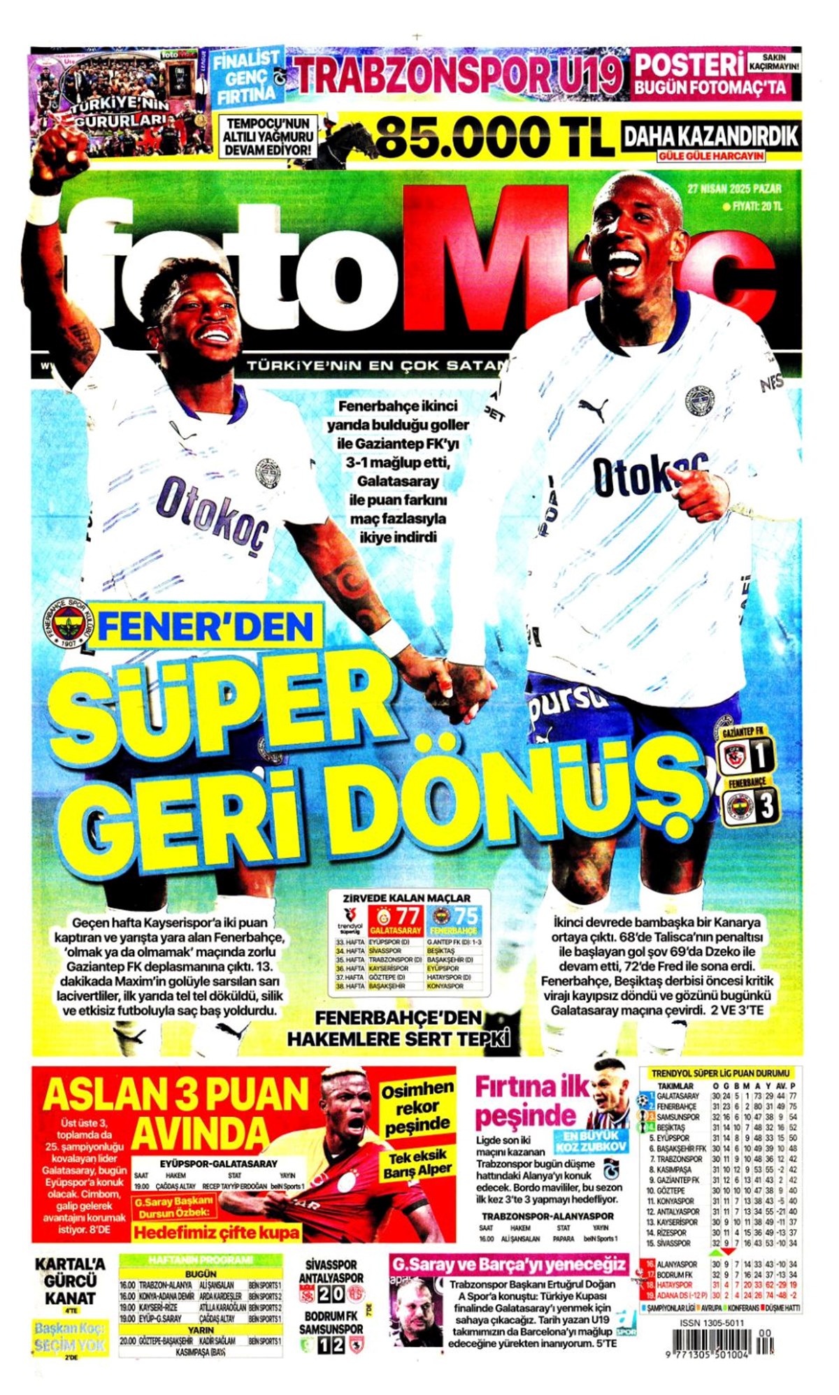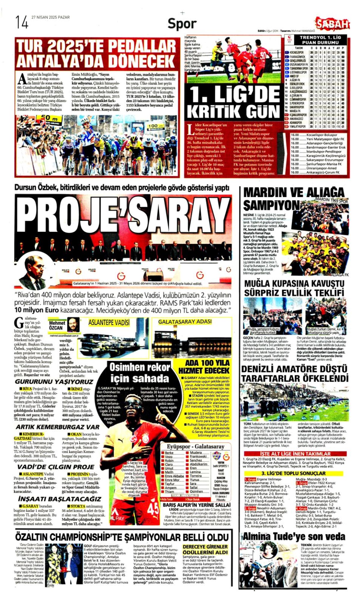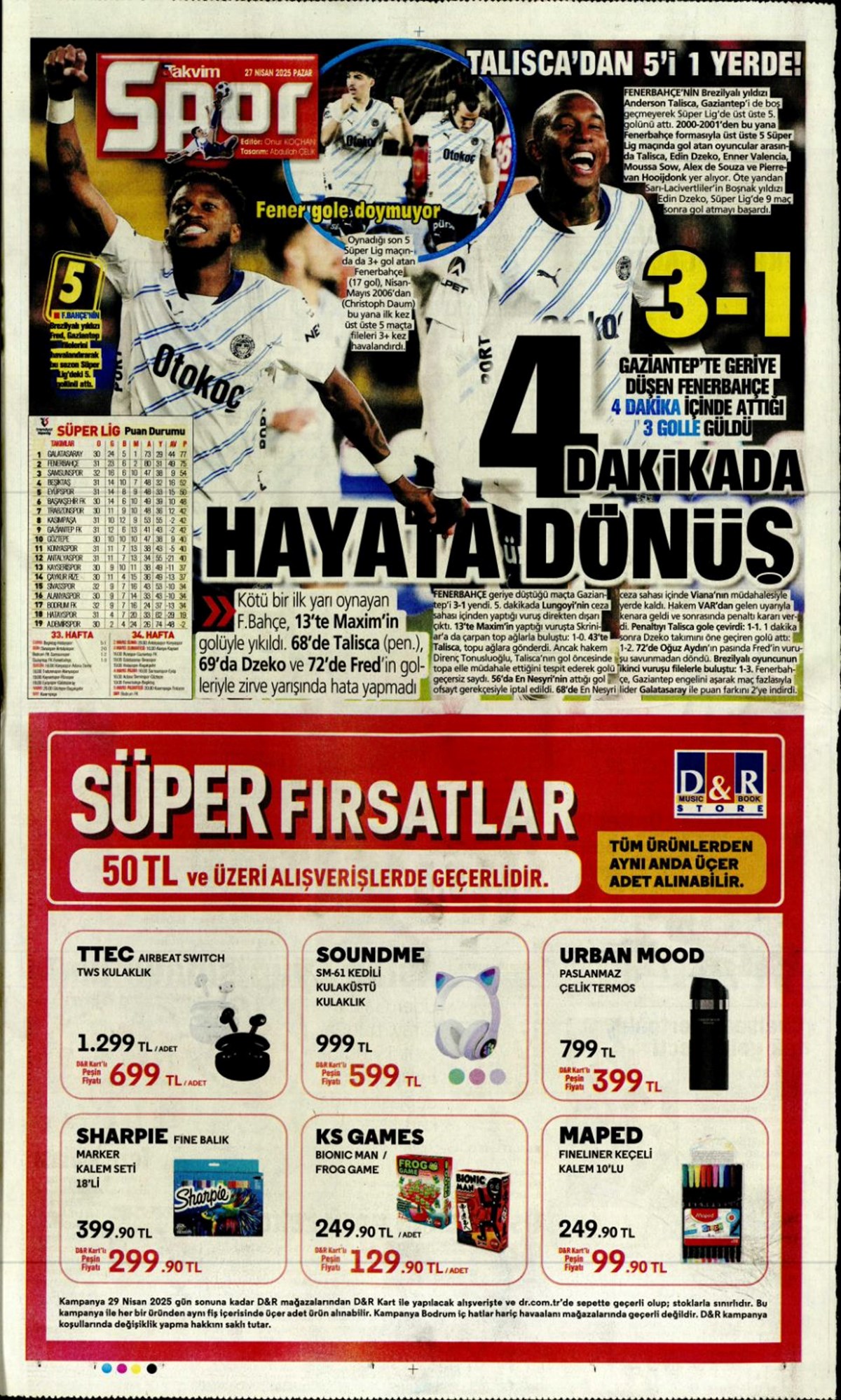 Günün spor niteliklerinde, son gelişmeler ve spor gündemindeki transfer haberleri açıklandı. 27 Nisan 2025 Gazete, Beşiktas, Fenerbahce, Galatasaray ve Trabzonsport’un News’un spor sayfaları 1 dakikaya bir göz atın.