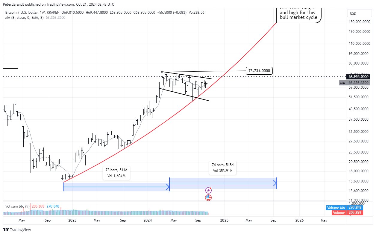 Usta trader Peter Brandt, 21 Ekim'de haftalık kapanışın ardından yayınlanan Bitcoin X yazışmasının bir parçası olan grafik hakkında “7 aylık ters genişleyen üçgen oluşmaya devam ediyor” yorumunu yaptı.