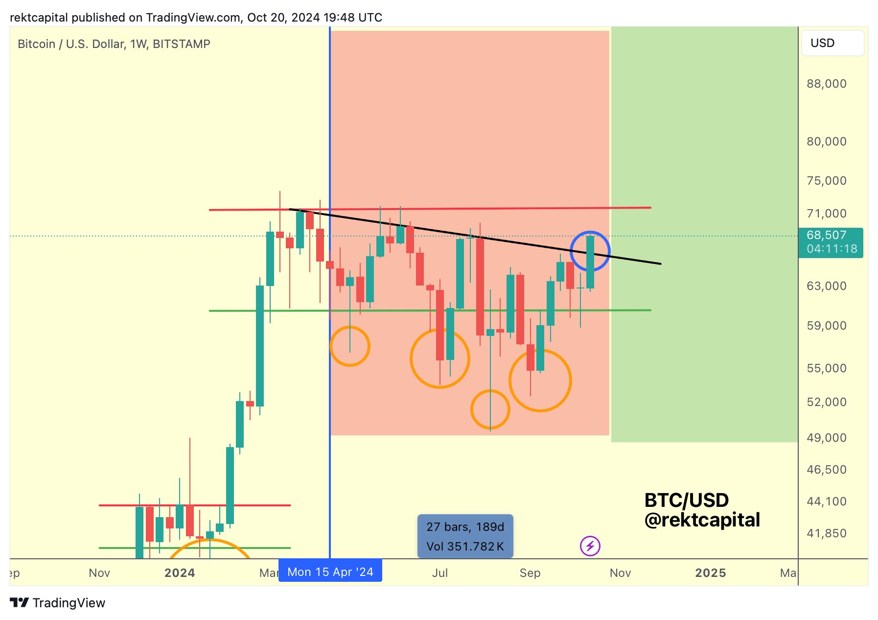BTC/USD haftalık grafiği. Kaynak Rekt Capital/X