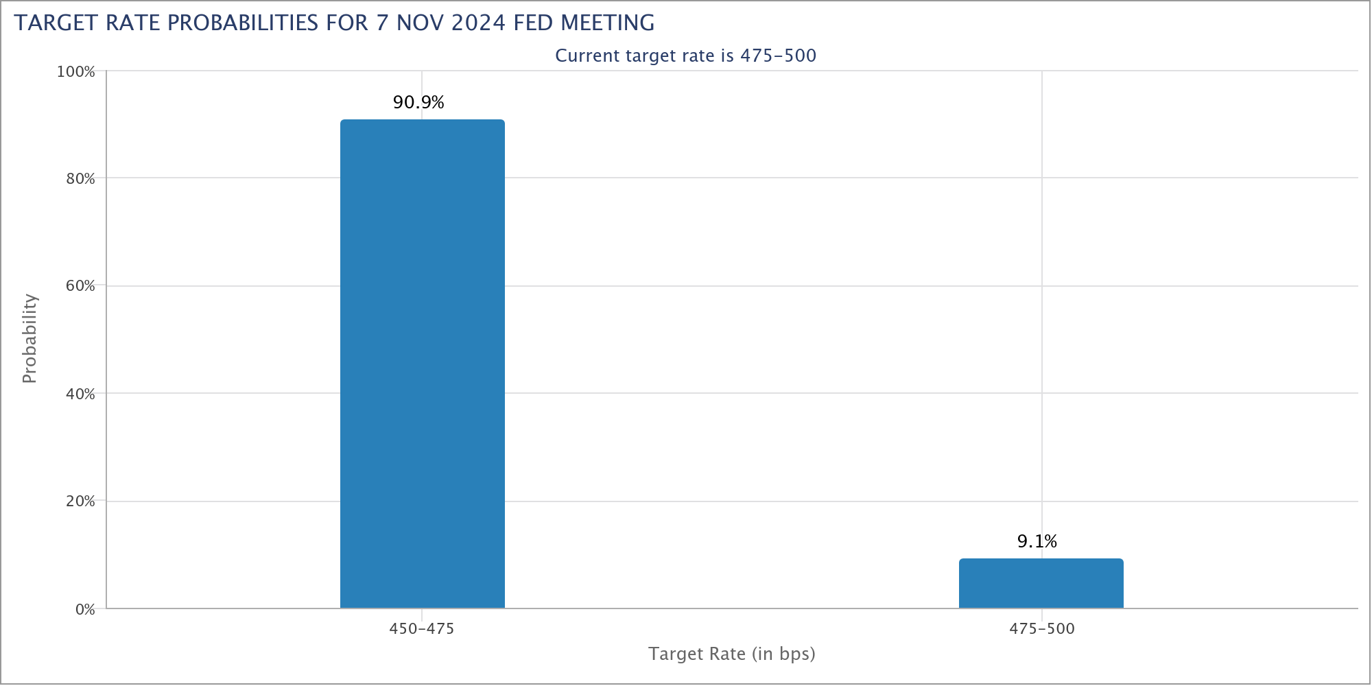 CME Group'un FedWatch Aracından elde edilen son veriler, Fed'in 7 Kasım'daki bir sonraki toplantısında %0,25'lik bir faiz indirimi ihtimalinin %90'ın üzerinde olduğunu gösteriyor.