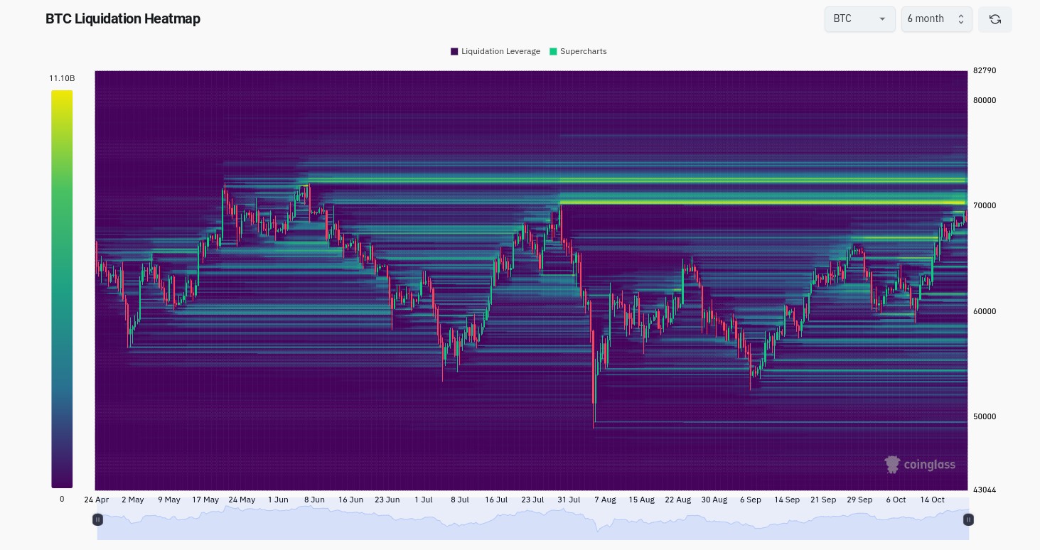 CoinGlass'ın son altı aydaki likidite seviyelerini gösteren verileri, talebin çoğunluğunun şu anda 70.000 doların biraz üzerinde olduğunu doğruluyor. 72.000 dolar civarında daha fazla direnç görülebilir.