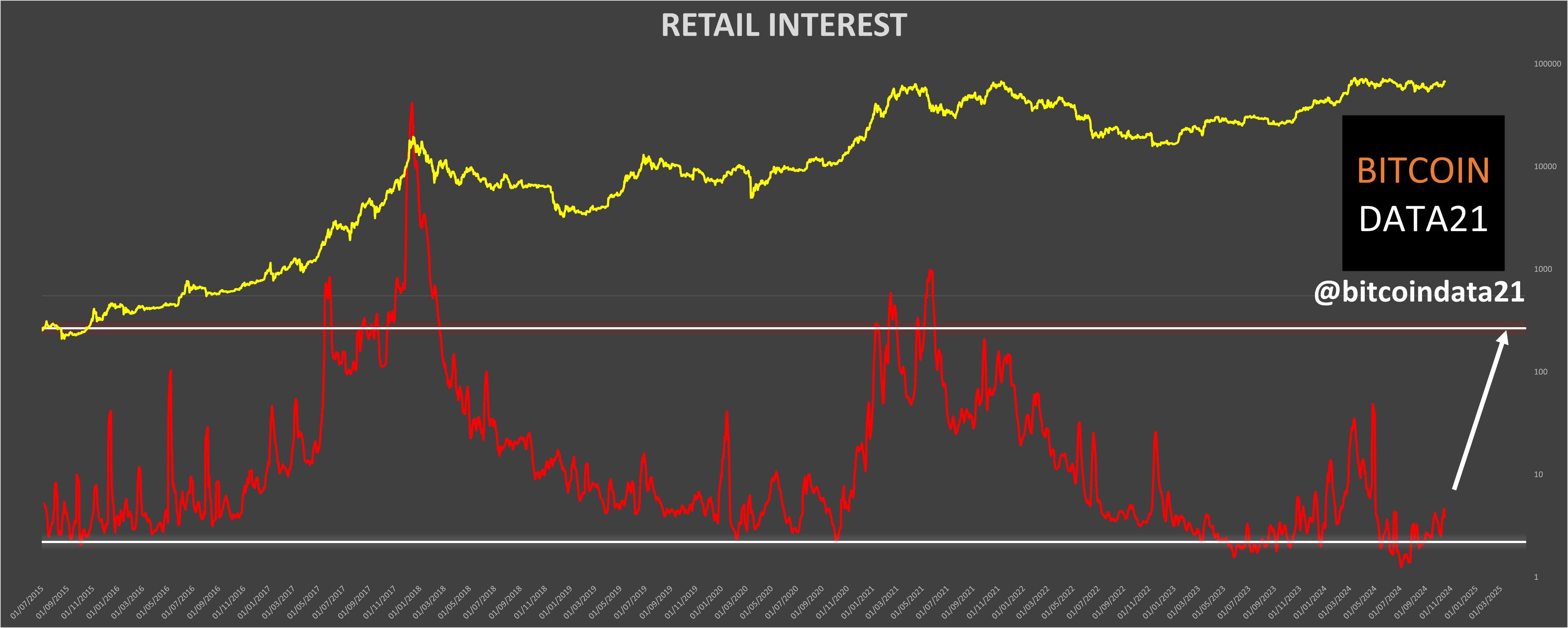 Geçtiğimiz hafta, popüler analiz hesabı X Bitcoindata2021, Bitcoin'de hızlı bir yükseliş olması durumunda perakende yatırımcıların ilgisinin toparlanacağını tahmin etmişti.