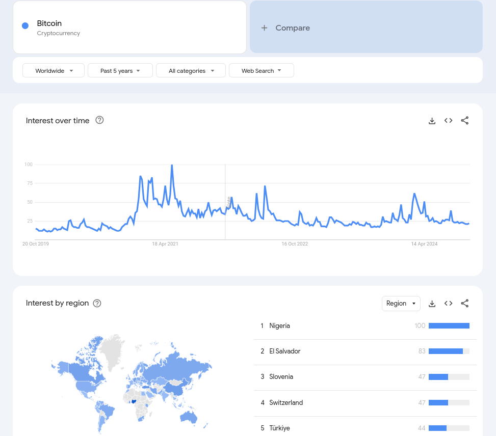 “Bitcoin” için Google arama verileri (ekran görüntüsü). Kaynak: Google Trendler